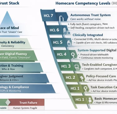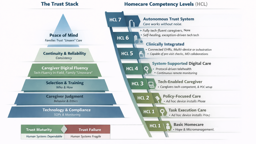 Drawing inspiration from the HIMSS EMRAM framework, which transformed how hospitals approached digital maturity, this paper introduces Homecare Competency Levels (HCL 1–7). Unlike hospital maturity models that focus on system adoption, HCL focuses on how reliably trust is produced, particularly through caregivers operating alone in unpredictable home environments.